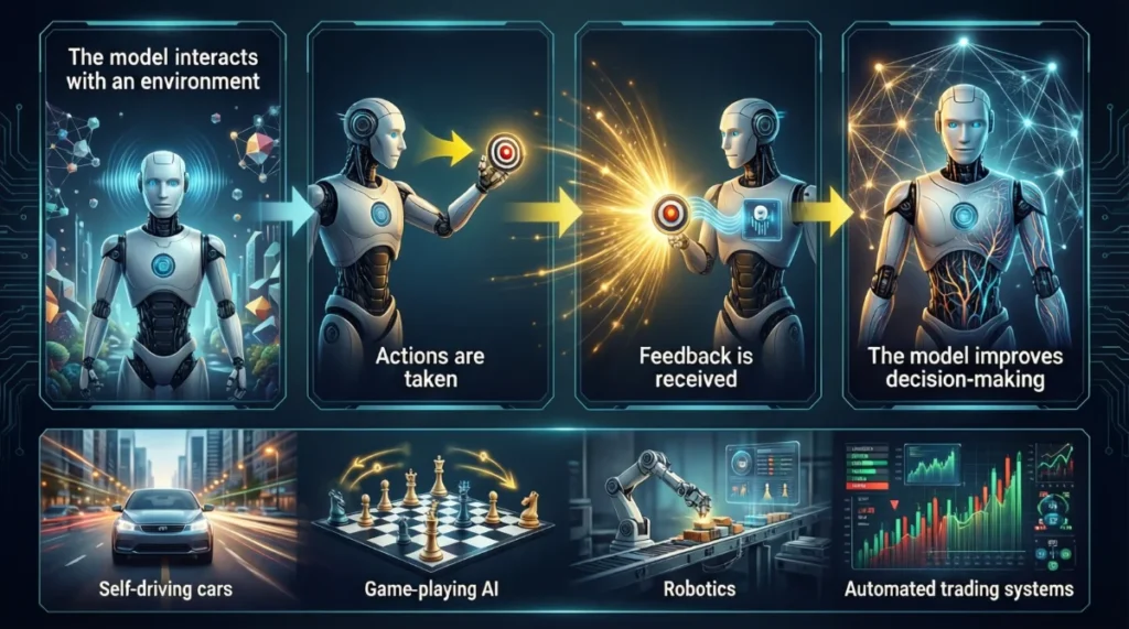 Reinforcement Learning is different from the other two types. Instead of learning from data directly, the system learns through trial and error.